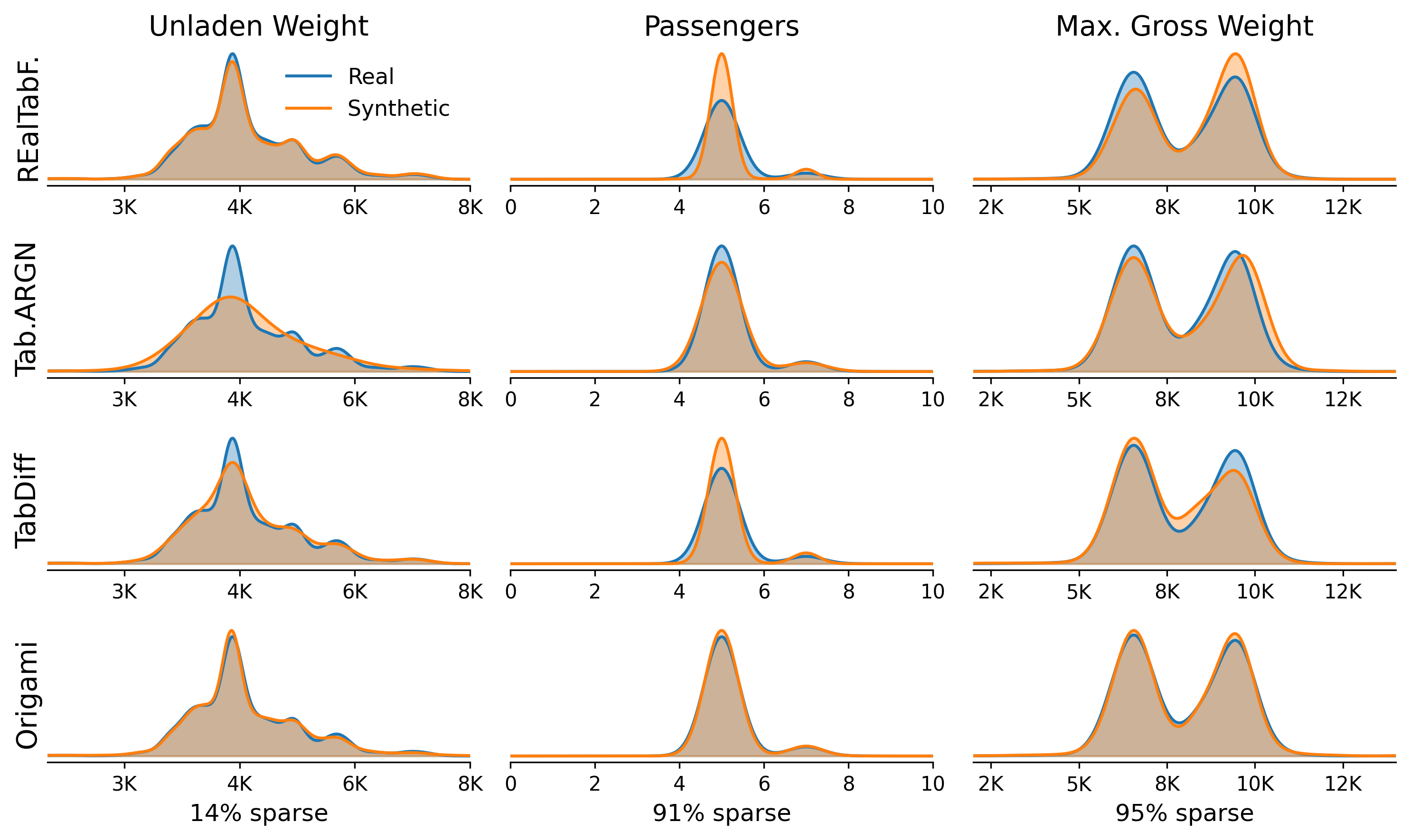 But where does it actually break down? The evaluation metrics don’t tell the full story. We looked at the raw density distributions of the numeric columns for Electric Vehicles — with only 11% sparsity, one of the easier datasets. Even here, the artifacts are visible. TabDiff’s distributions are dominated by the imputed column mean, distorting the true distributions. TabularARGN and REaLTabFormer show discretization artifacts where continuous values have been binned, e.g., a smoothed-out curve for TabularARGN’s Unladen Weight column due to its uniform intra-bin sampling approach. ORiGAMi’s distributions follow the real data closely.