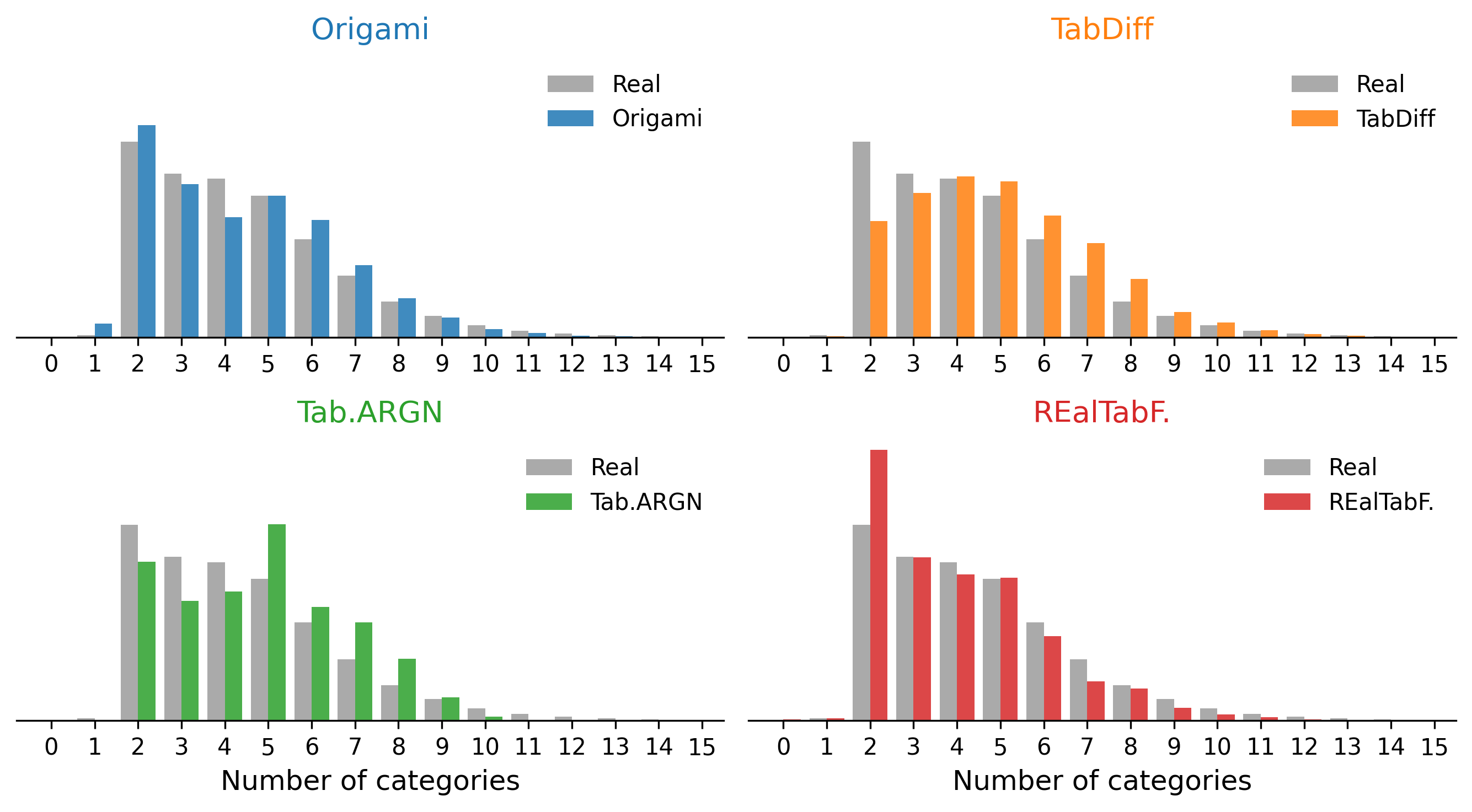 Arrays expose a different failure mode. When a tabular synthesizer generates values for categories.0, categories.1, categories.2, and so on independently, the number of non-null entries in those columns determines the implied array length. There is no mechanism to model that length explicitly. ORiGAMi, operating on JSON sequences directly, learns the length distribution as part of the sequence model. The difference is visible in the Yelp categories array: REaLTabFormer has a strong outlier at length 2, and TabularARGN and TabDiff overshoot toward longer arrays. ORiGAMi’s array length distribution matches the real data most closely.